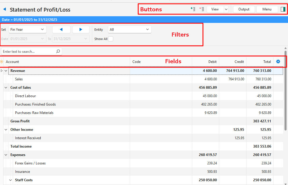 Total | The total movement for the selected period: – Cost of Sales and Expenses: The value represents the debits less credits. If the credits exceed the debits the number is negative. – Revenue and Other Income: The value represents the credits less debits. If the debits exceed the credits the number is negative. |
