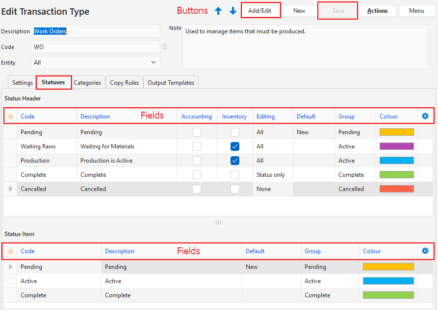 | Default | Every transaction must have a default New status for its items (e.g. Pending). The New status is assigned when a new record is created. |