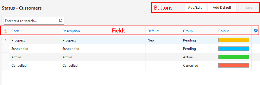 | Group | Every status must be allocated to a group. The group options are: – Pending: Used for records that must still be approved or are suspended. – Active: Used for records that are active and in use. – Cancelled: Used for records that should no longer be used (e.g. a customer closed their account). |