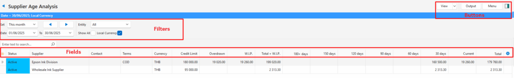 Output | Prints, previews or emails reports if Output Templates are created. Supplier Remittance Advices are normally one of the templates and are emailed from the age analysis. Supplier ledgers have different output options. |