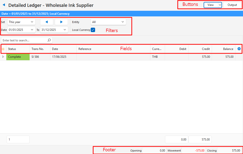Output | Prints, previews or emails reports if Output Templates are created. Supplier Remittance Advices are normally one of the templates and are emailed from this interface. Lists the same options that are available under Supplier Age Analysis. |