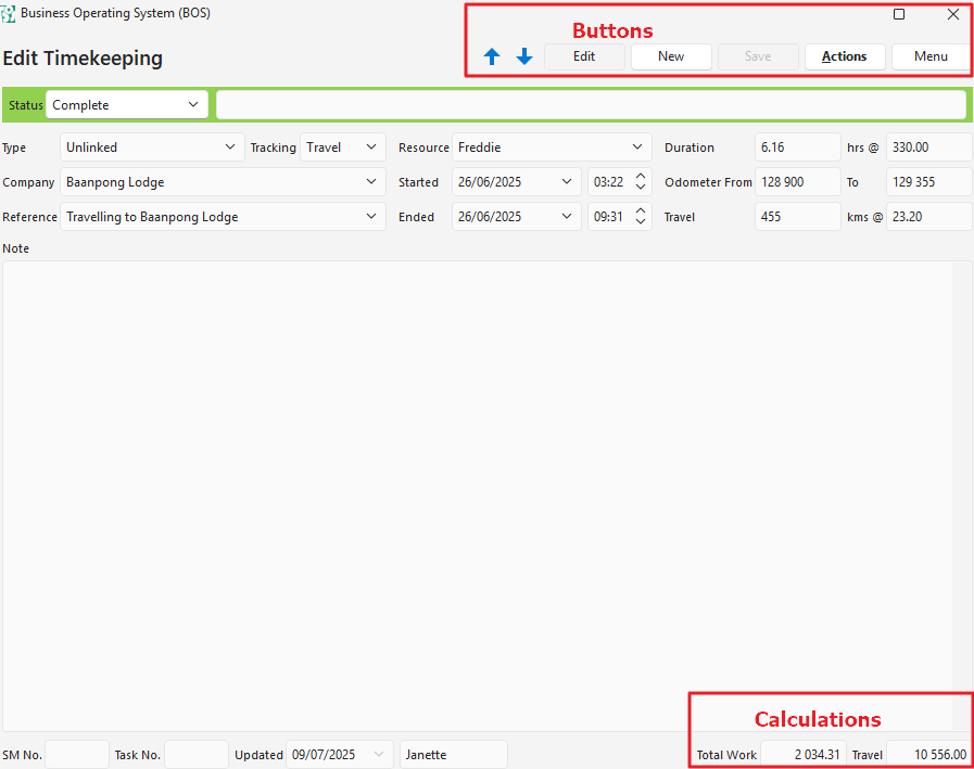 kms@ | A field to type the Rate per Kilometre which can be the rate the User is paid, or the rate that the Customer must be charged. The cost is shown in the footer next to Travel. |