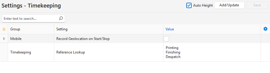 - Mobile > Record Geolocation on Start/Stop: Check the box in the Value column if you want to record the User’s Location when they start and stop a Timekeeping record.