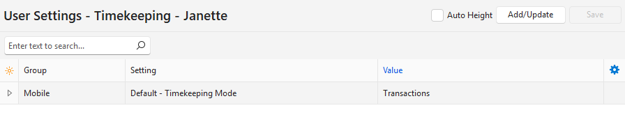 - Mobile > Default Timekeeping Mode: Click the Value column and select one of these options from the dropdown list: