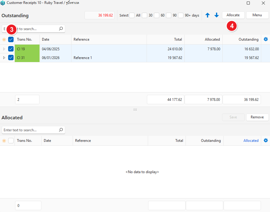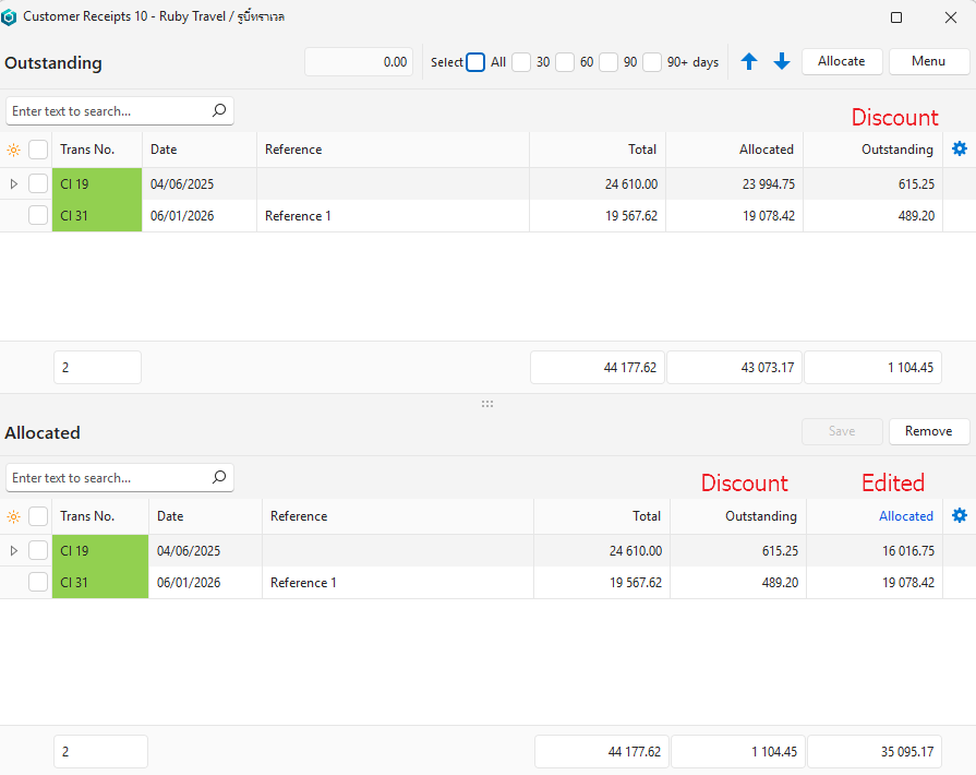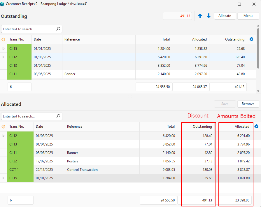 - Edit the amounts in the Allocated column by overtyping them. For example, if a customer receives a settlement discount, each payment should be reduced by the discount amount.