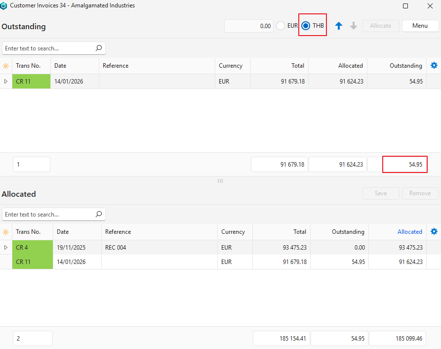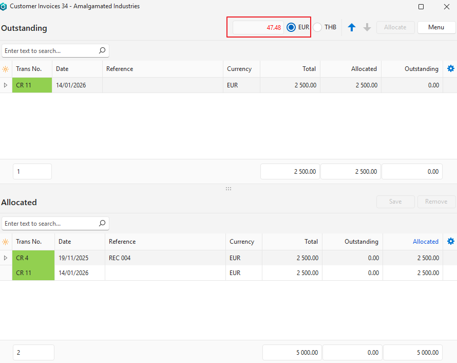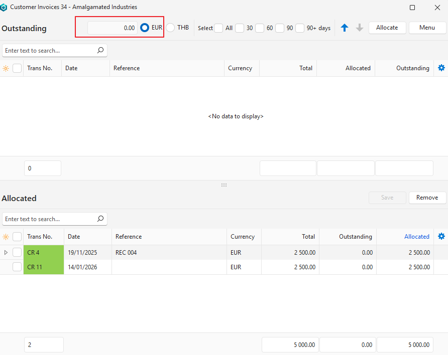 In this example, a payment is allocated to invoices. However, credit notes can be allocated to invoices using the same procedure. If activated from an invoice, the list of outstanding entries are unallocated credit notes or customer receipts.