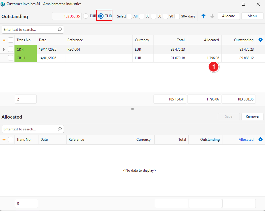 - The currency displayed in the Currency column is the transaction’s currency, not the allocation’s currency.