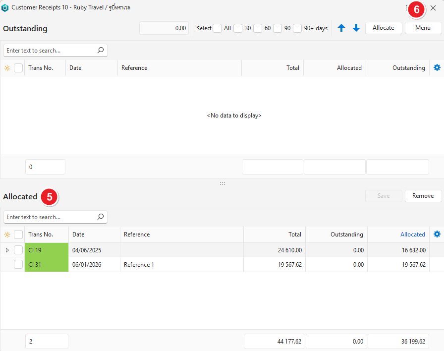 - If the allocated amounts differ from the receipt amount, you are asked if you want to change the receipt amount.