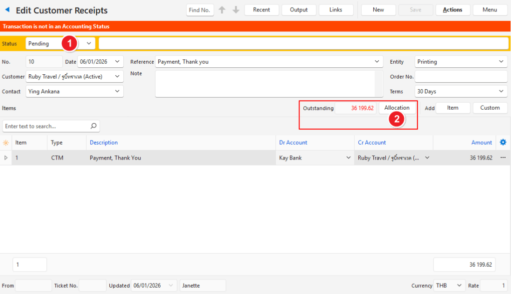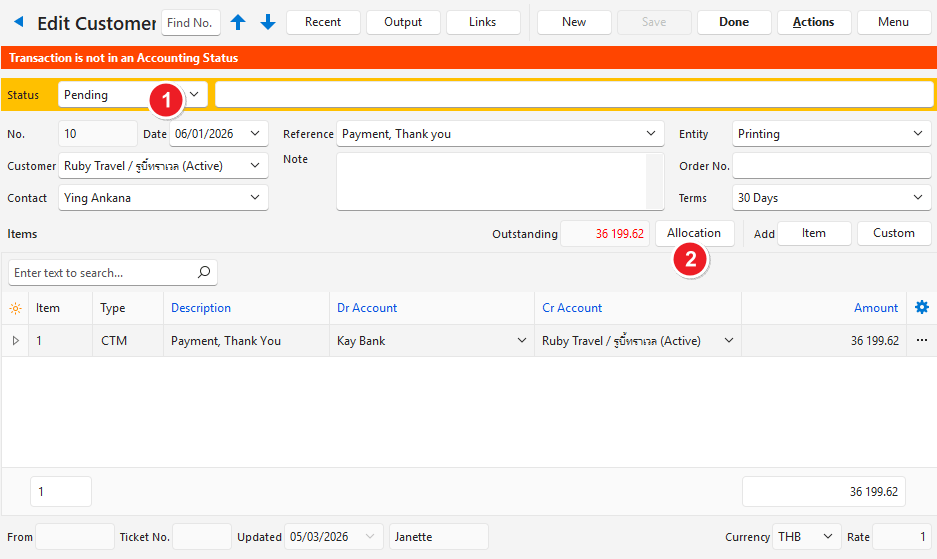 - Ensure the transaction can be edited (i.e. the transaction’s Status must allow editing). Change the status if necessary and if you have the required permissions.