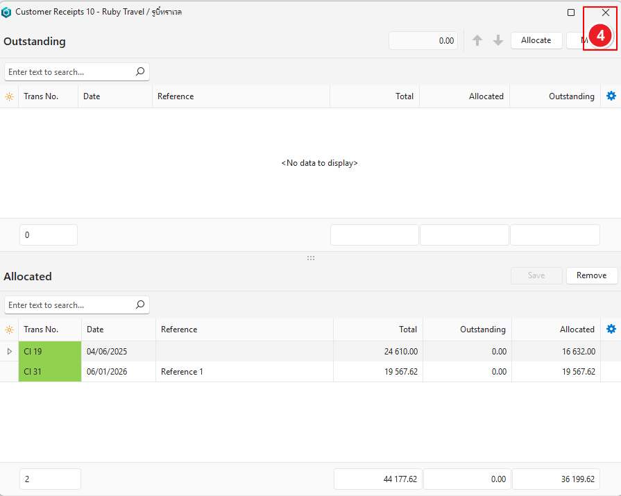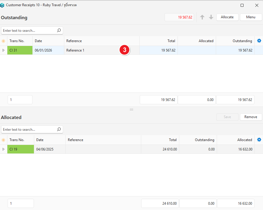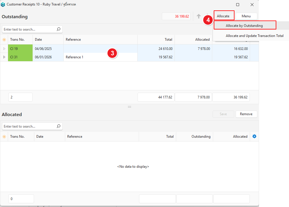 - Click Allocate (button)> Allocate by Outstanding.