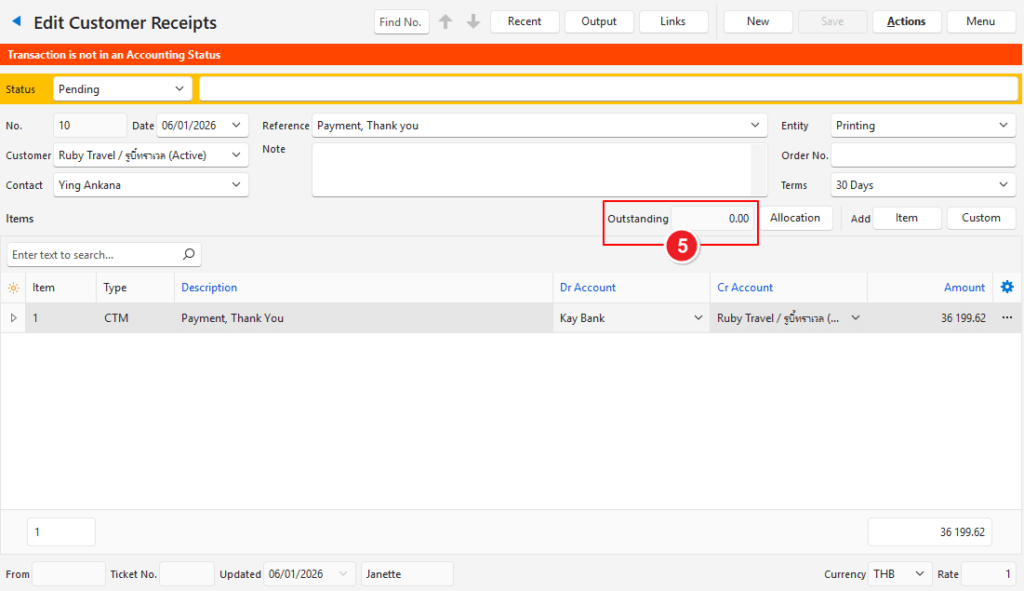 | Outstanding | The total amount on the transaction that has not yet been allocated. |