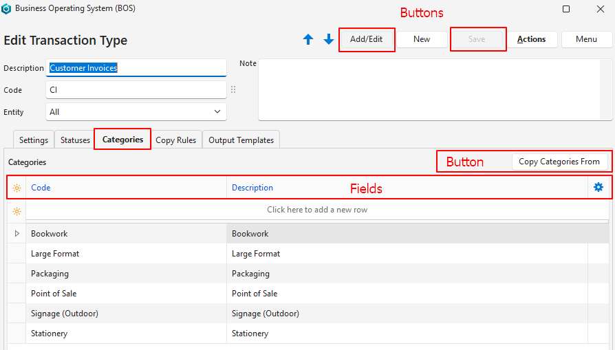 | Copy Categories From | Provides a dropdown list of transaction types that have categories. Replaces the current transaction type’s categories with those of the selected transaction type if confirmed. |