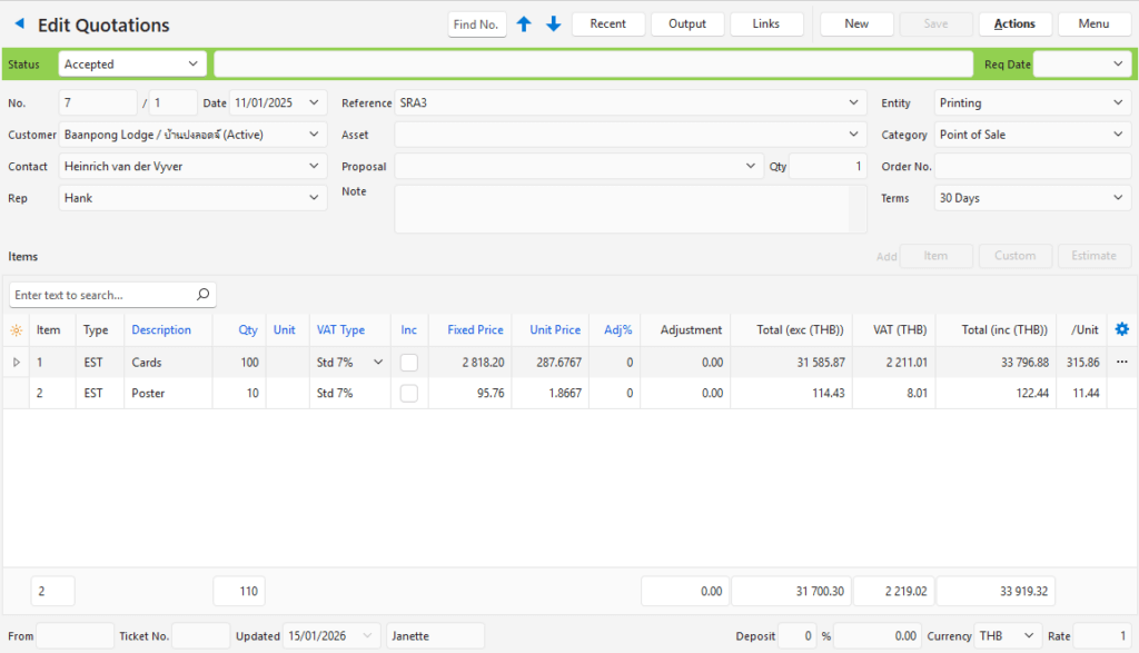 - If the customer decides to go with 100 instead of 50, you navigate to the linked estimate and change the Active Quantity and output the quotation again. No other changes are needed.