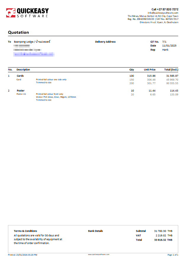 - Quotations can have version numbers to allow customers more options such as brochures with different paper options, or a product with different packaging options.