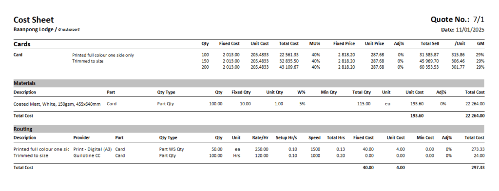 - A cost sheet can be generated for every quotation. It lists every item on the quotation with costing data.