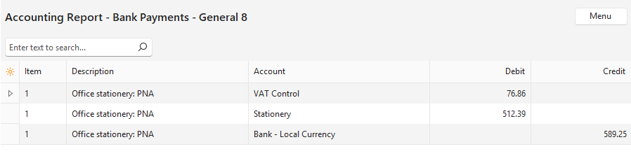 - The Accounting report shows which accounts are debited and credited and is accessed by clicking Menu (button) > View Accounting Report.