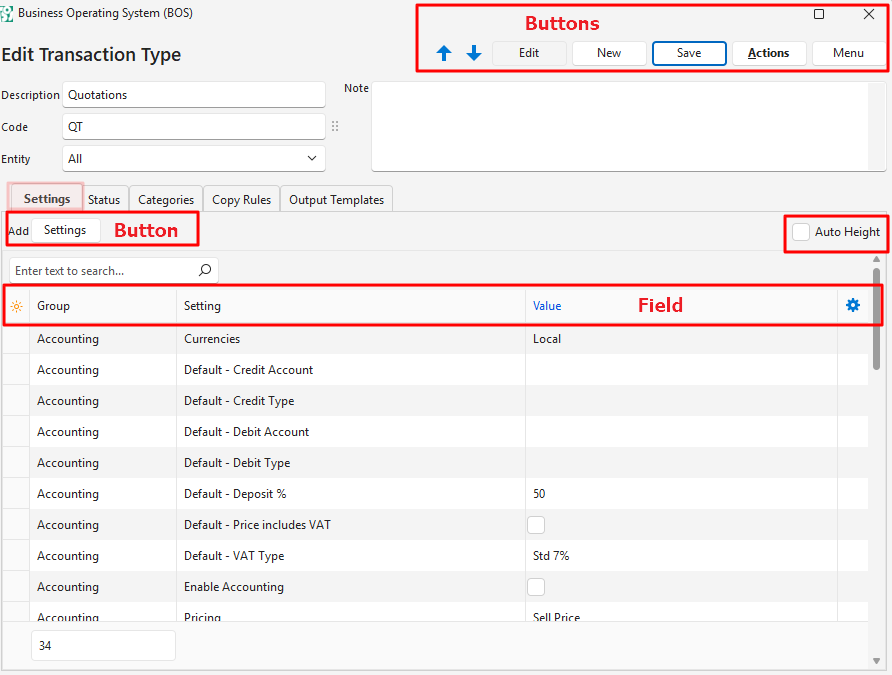 General > Enable Version Numbers | A checkbox. If checked version numbers are enabled (e.g. Quotation versions). This setting cannot be changed if there are transactions. | Unchecked | Applicable to inventory, customer, and supplier transactions but normally only used for quotations. |