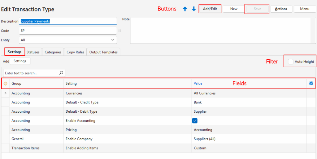 | General > Transaction Number | Specifies how transaction numbers are allocated when the transaction type is first created. The options are: – Edit: Allows users to edit/enter numbers only (e.g. for supplier invoices). A warning is displayed on the red warning bar if a duplicate transaction number is entered. – Generate: The system automatically generates numbers in sequence. – Generate (Entity): The system automatically generates numbers in sequence for each entity. | Generate | Applies to all transactions. Customer documents: Generate or Generate (Entity) ensures invoices and credit notes are issued in sequence. Supplier documents: Edit allows users to type the supplier’s document number in the document number field. (The number can also be typed in the reference field.) |