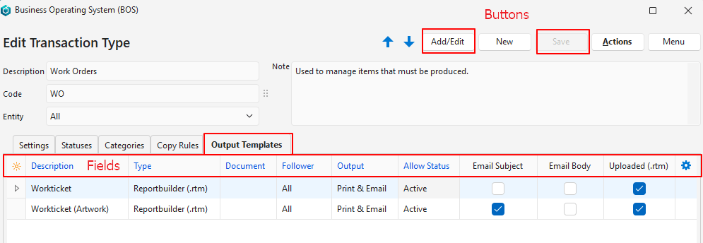 | Edit | Allows the Output Templates (tab) to be edited. |