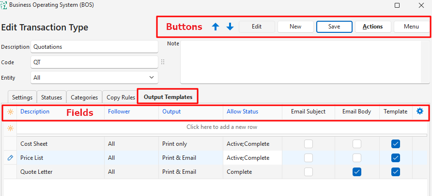 Navigation: Main Menu > Transaction Types > Double-click a Transaction Type > Output Templates (tab)
