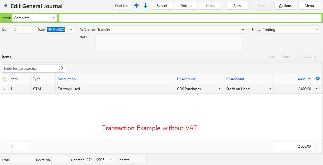 | Dr Account | The account that should be debited. If a Debit Account Filter is used, the caption is changed to the name of the filter. These filters are case insensitive (e.g. Bank Account instead of Dr Account). These filters only apply to ledger accounts. |