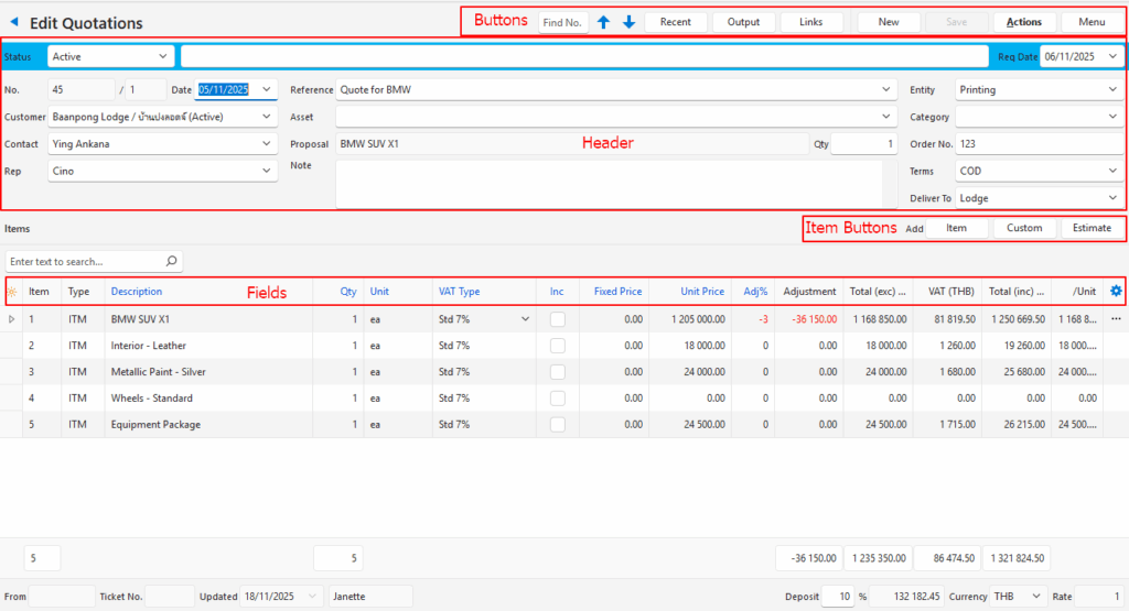 - A Transaction can contain multiple line Items. It can also contain a mixture of the different options available (e.g. a single quotation can include one or more items, custom entries, and estimates.)