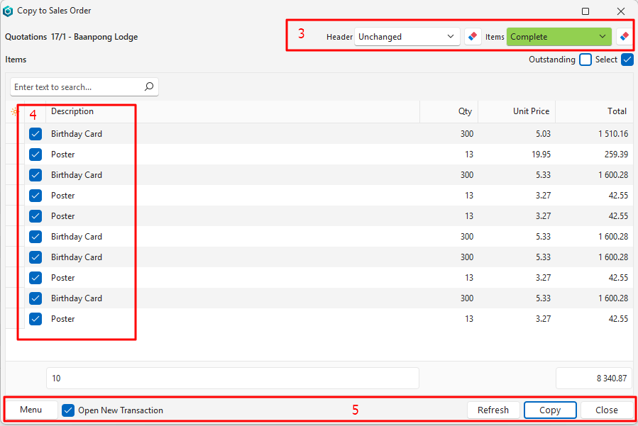 - The Outstanding checkbox toggles displaying all the items or only those that have not yet been copied.