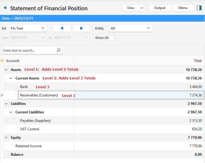 - Level 1: The top folders are the Statement of Profit or Loss and the Statement of Financial Position.