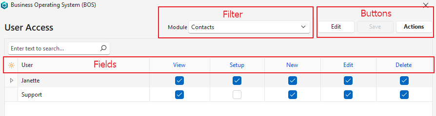 Navigation: Main Menu > Setup > Users > Actions (button) > View/Edit User Access by Module