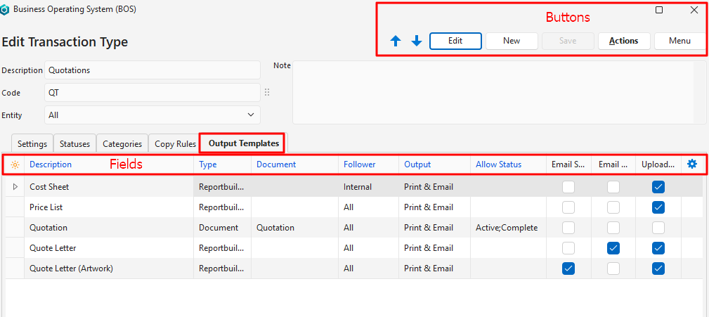 - แบบฟอร์มถูกสร้างและบันทึกเป็นเทมเพลต ซึ่งจะถูกเชื่อมโยงกับแต่ละธุรกรรม (เช่น ใบแจ้งหนี้ลูกค้า) หรือโมดูล (เช่น การวิเคราะห์อายุลูกค้า)